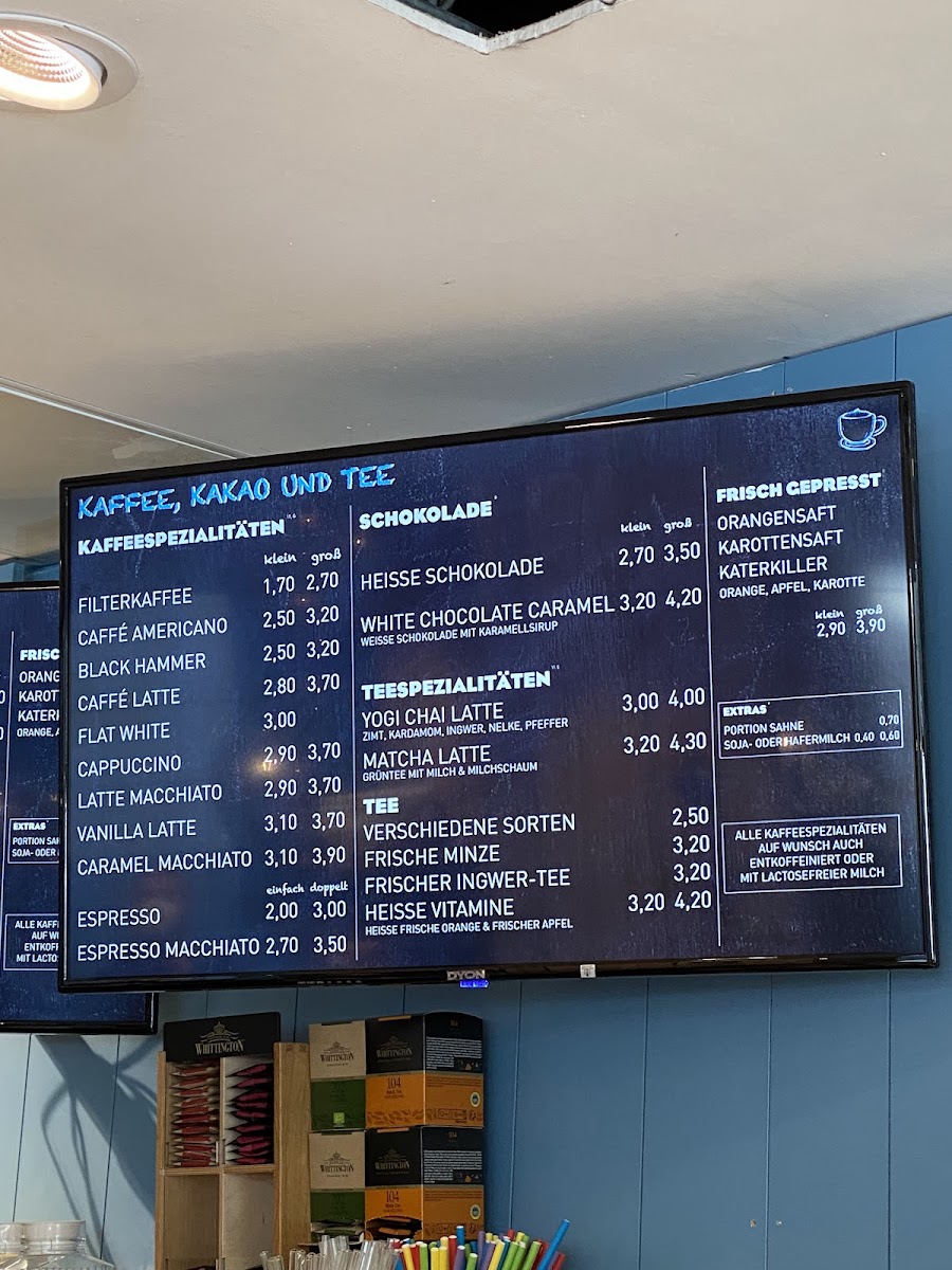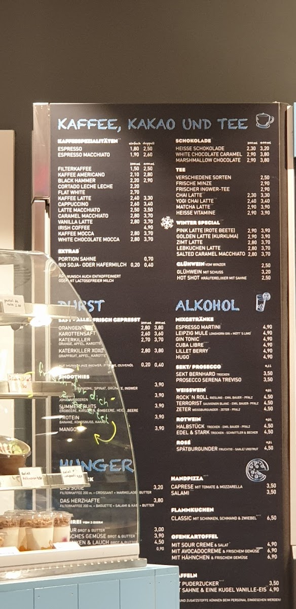 The menu is organized to accommodate quick orders as well as casual dining, with choices appropriate for a morning start, afternoon snack, or light meal. Items like dry bagels with cheese and falafel focaccia provide savory options, while desserts and pastries cater to guests looking for a sweet accompaniment to their drinks.